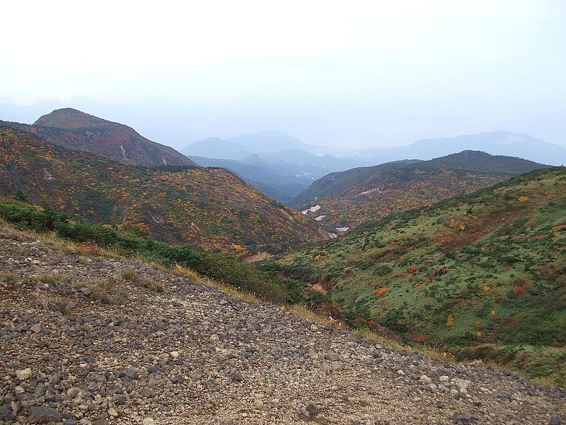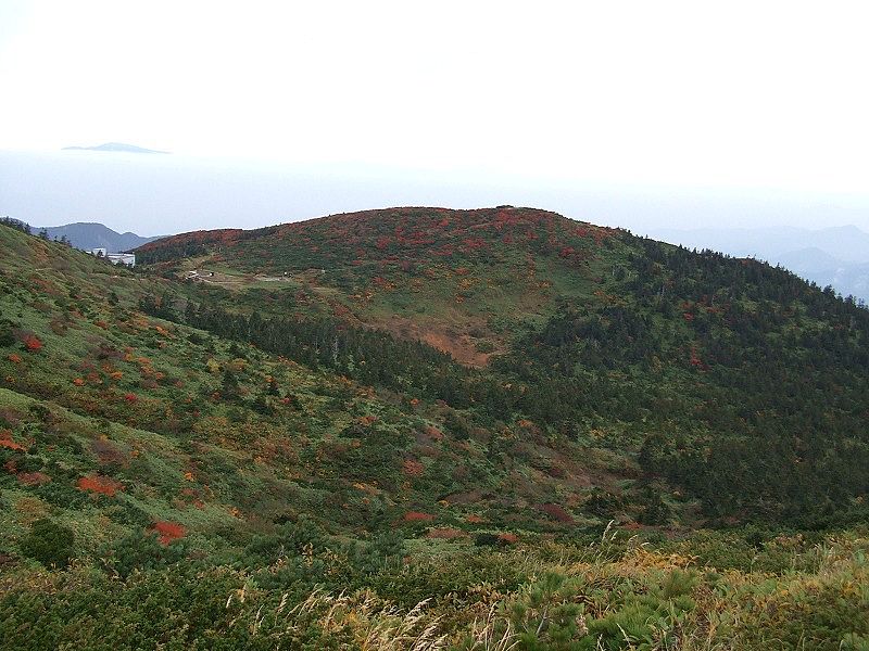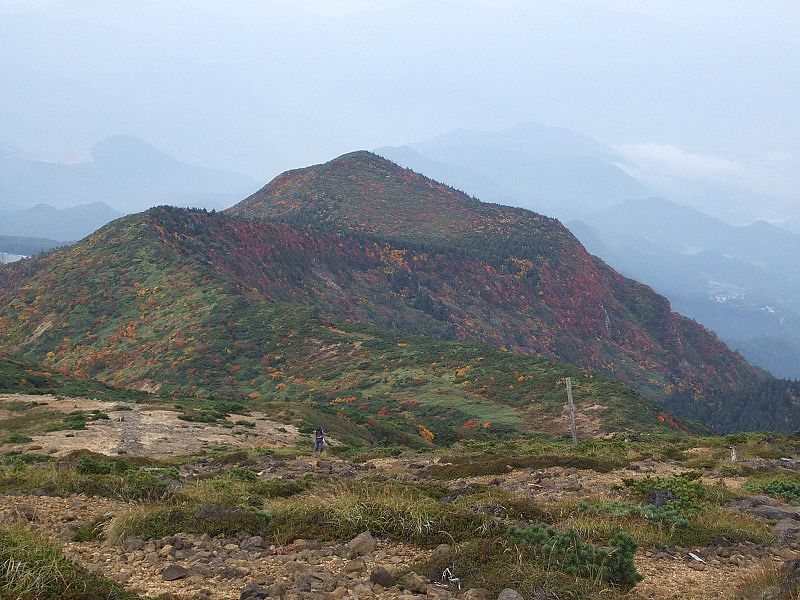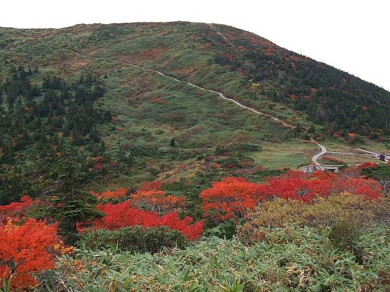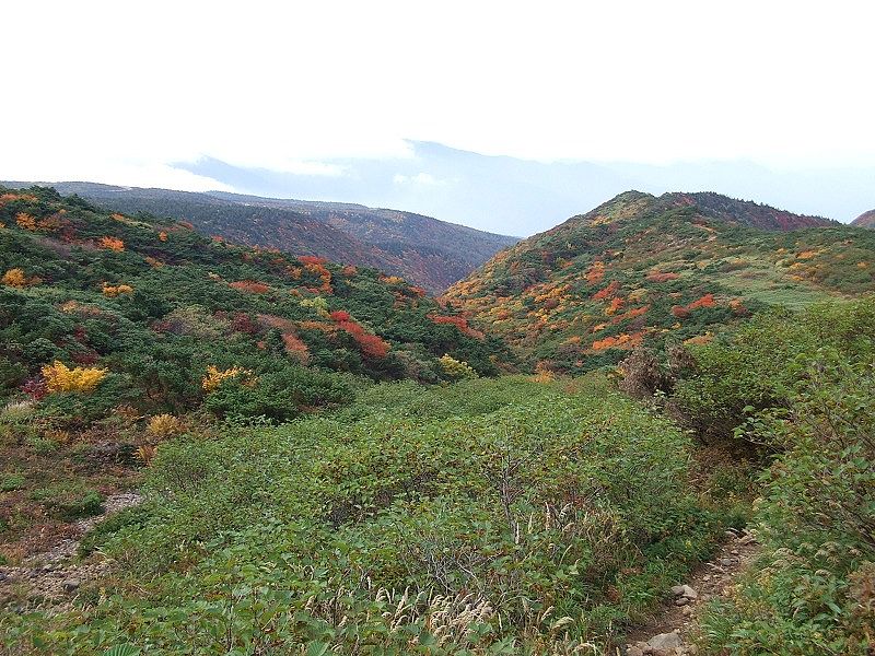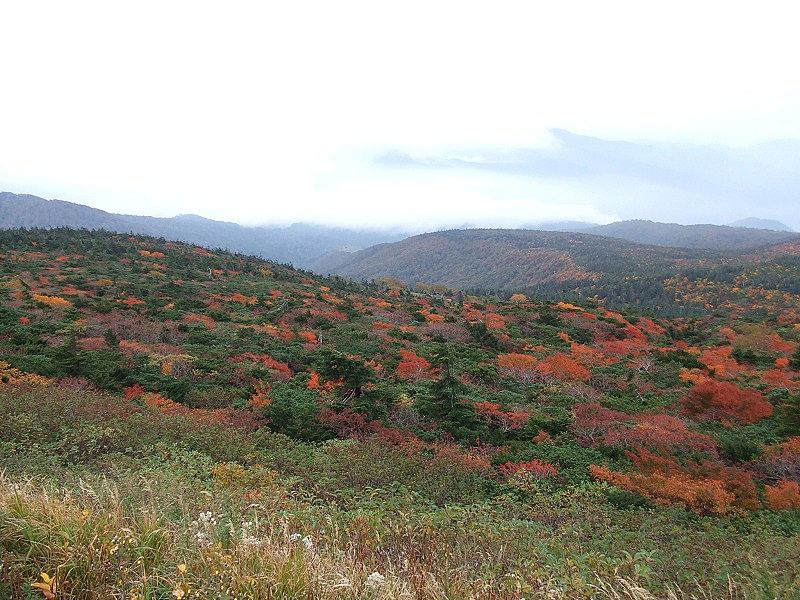 熊野山頂の賑やかさに反して、熊が出て来そうなくらい静かな登山道である。手を叩きながら進む。それにしても振り返る熊野の斜面が彩られて美しい。中丸山東コルまではアオモリトドマツの樹林帯で冬は樹氷原となるが、この時期は甘い香りが漂って癒される。