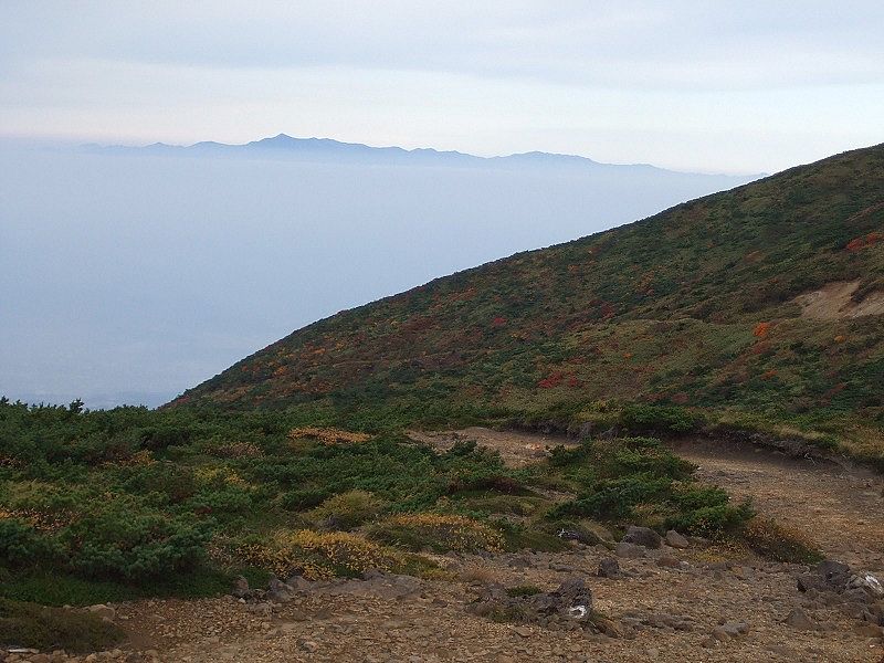 地蔵山頂はパスしひときわ赤く見える三宝荒神を目指す。モミジやドウタン・ナナカマドが真赤だ。山頂からは雲海に浮かんだ朝日連峰・月山・鳥海山が美しい。しばしうっとりしてから熊野まで戻ることにする。十字路からの復路はショートカットの直登コースで。山頂の茂吉の歌碑から少し下がると中丸山が良い感じだ。お、誰か1人登ってくる。聞くとライザからのピストンらしい。途中の紅葉が綺麗だとのこと。やはり何としても行って来なければ。