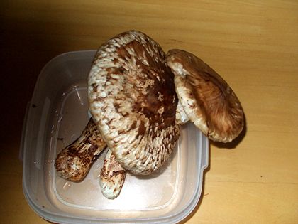 マツタケが採れたら良いなあと目的地に向かって歩いている途中、藪の中に上山で「赤キノコ」と呼ばれているサクラシメジのでかいのがごっそりと生えている。ひだも奇麗で上ものだ。見るとそこにもあそこにも生えているではないか。ハケゴが一杯になるほど採って、ふと何の気なしに視線を斜め上方にずらすと、ん?!ありました。傘の開いたマツタケ2本発見。